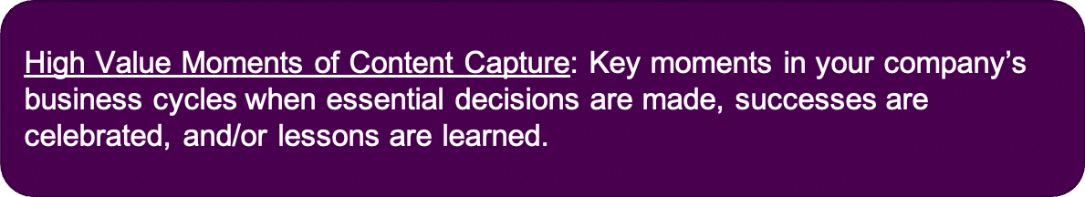 High Value Moments of Content Capture: Key moments in your company's business cycles where essential decisions are made, successes are celebrated, and/or lessons are learned.