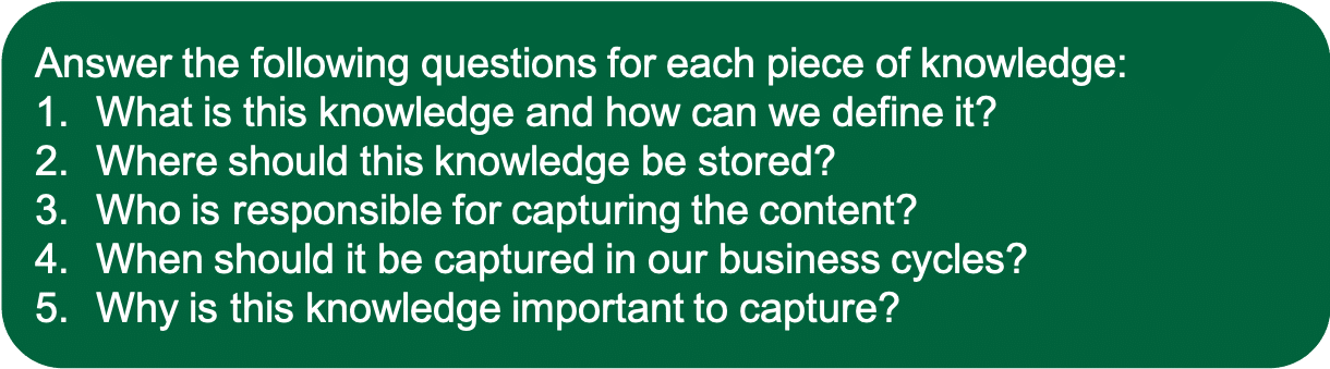 Answer the following questions for each piece of knowledge: What is this knowledge and how can we define it? Where should this knowledge be stored? Who is responsible for capturing the content? When should it be captured in our business cycles? Why is this knowledge important to capture?