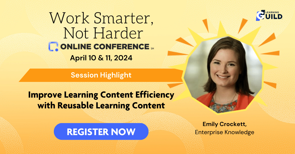 Rebecca Wyatt, Partner and Director for Enterprise Knowledge’s Advanced Content Team, and Emily Crockett, Content Engineering Consultant, will deliver a hands-on micro master class on “Improving Learning Content Efficiency with Reusable Learning Content” at The Learning Guild “Work Smarter, not Harder” online conference on Wednesday, April 10, at 2:30 PM EST/ 11:30 AM PST. Wyatt and Crockett will walk participants through the process of creating a reusable learning content model as well as best practices of dynamic content. The session will also explain how reusable content enables the personalization of the learning content to achieve optimal learning and performance outcomes, while ensuring consistency, accuracy, and efficiency.