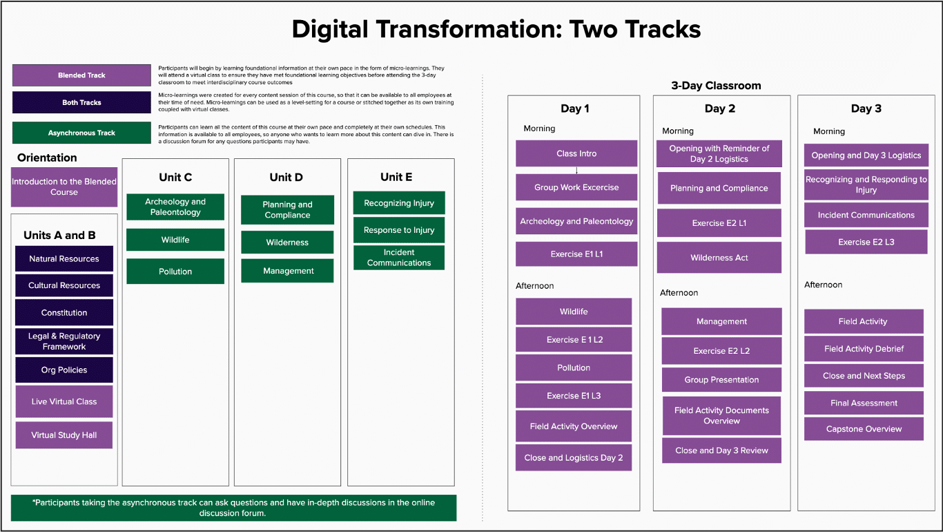 Enterprise Knowledge (EK) worked with a federal agency tasked with preserving our nation’s natural and cultural resources to transform instructional programs and maximize their accessibility and effectiveness. Traditionally, training at this agency is held in-person in a classroom. However, due to the pandemic some of these fundamental courses were paused indefinitely. While the in-person classroom has its benefits, it can be costly and requires students and instructors to travel to a location making several foundational offerings limited to just several times a year and only to a select group of students. The resource preservation agency approached EK to re-evaluate some of these in-person classes to better fit the needs of their learners.