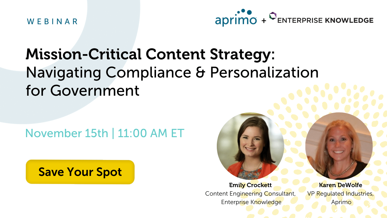 Enterprise Knowledge’s Content Engineering Consultant, Emily Crockett, will join Karen DeWolfe, VP of Regulated Industries at Aprimo, for a co-hosted live webinar, “Mission-Critical Content Strategy: Navigating Compliance & Personalization for Government” on Wednesday, November 15th from 11:00 AM – 11:30 AM EST.