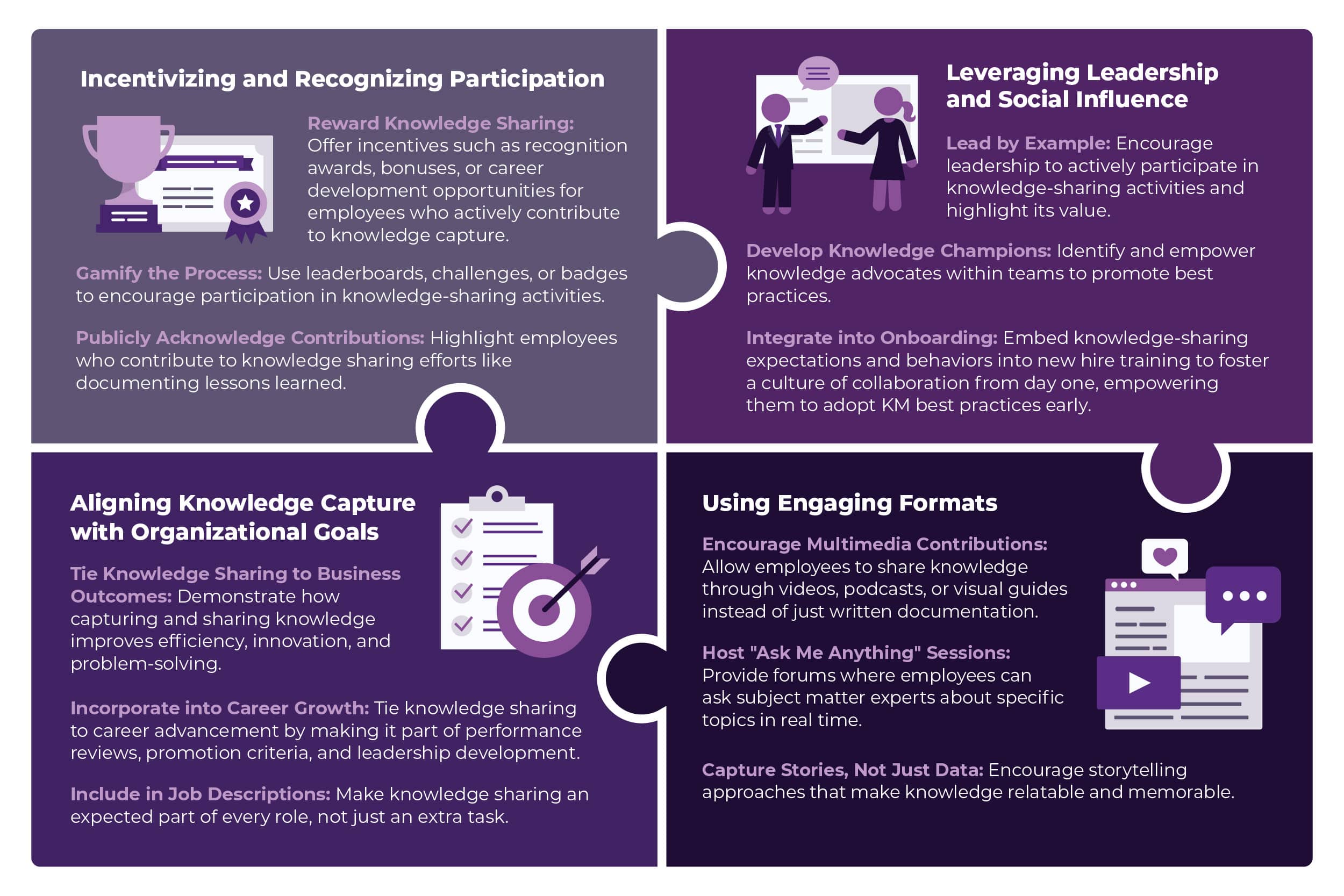 This infographic showcases practical strategies we’ve implemented to foster knowledge sharing, ensuring critical expertise is captured, collaboration flourishes, and teams are equipped for long-term success.