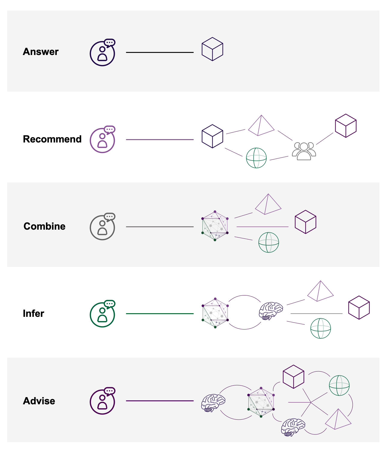 - Advise – Beyond Infer, the primary target for many organizations regarding Knowledge AI is for their systems to spot trends, identify potential risks and opportunities, and provide actionable guidance leveraging a complete view and understanding of the knowledge and information that exists. Though the potential and even much of the necessary technology is there, for most organizations, the structure of information and the documented decision-making logic will be the limiting factors to achieving this level of Knowledge AI. Each step along this range of capability levels, if designed correctly, will help an organization get closer to their end goals for Knowledge AI as long as the overall business drivers of the organization and goals of the individual end users are kept at the center of the process.